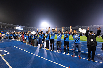 川崎フロンターレが勝利時、試合直後にピッチ横トラック上にて、選手とハイタッチをし、共に万歳三唱をします。