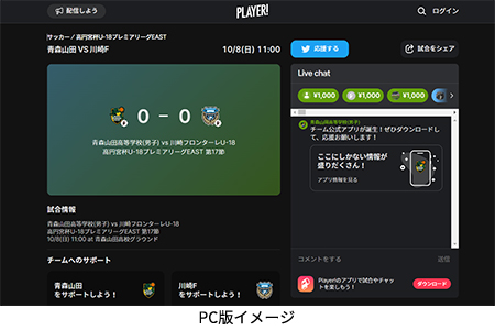 今シーズンもフロンターレアカデミーの選手たちの戦いぶりをタイムリーに皆さんにお届けするため、スポーツライブエンターテイメントアプリ「Player!」にて試合速報を実施します。
