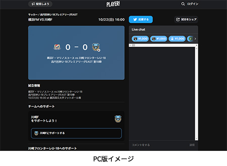 今シーズンもフロンターレアカデミーの選手たちの戦いぶりをタイムリーに皆さんにお届けするため、スポーツライブエンターテイメントアプリ「Player!」にて試合速報を実施します。