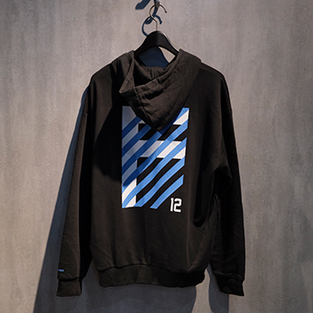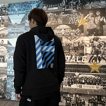 背中には今シーズンのユニフォーム柄をイメージしたプリントをデザインし、前面にはフロンターレブルーのプーマキャットロゴでシンプルに仕上げました。左袖の袖口にはクラブスローガンである「FOOTBALL TOGETHER」を入れた、PUMAとのコラボグッズです。裾口がすぼまっているのでストリートチックな着用がオススメです!!