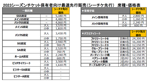 | 席種・価格 | ◇2023シーズンチケット保有者向け最速先行販売(シーチケ先行)特別販売価格(固定価格)
