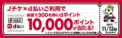 キャンペーン期間中、1回500円(税込)以上のお買い物時に「d払い」でお支払いいただくと、JリーグIDとdアカウントを連携している方の中から抽選で300名様にdポイント10,000ポイントをプレゼント!