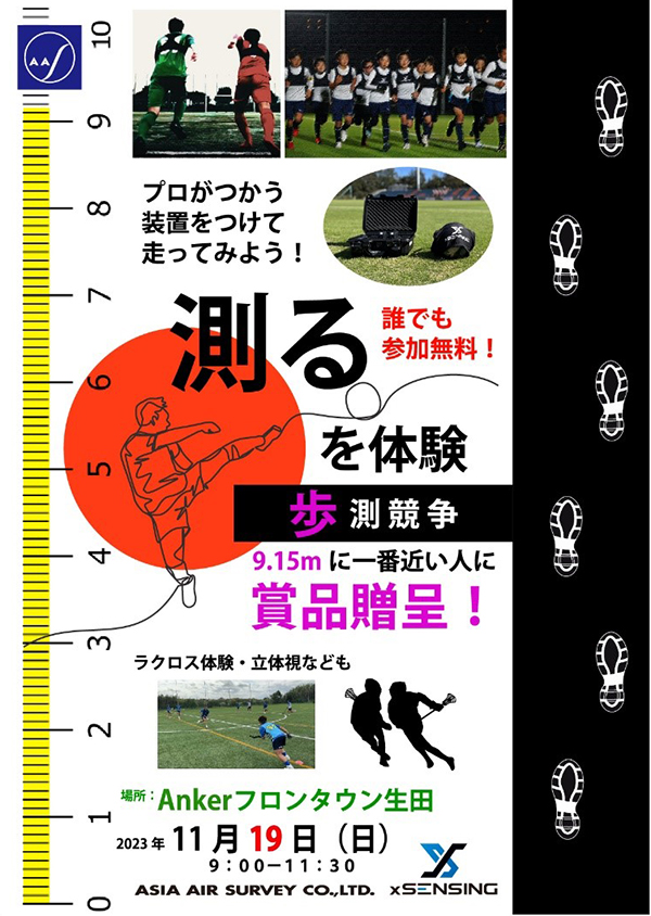 当日は、プロが使う装置をつけての大学生とのスピード競争、ラクロス体験や、お子様でも気軽に参加できて、かつ無料で楽しめる「測るブース」コーナーが設けられます。皆様のお越しをお待ちしております。