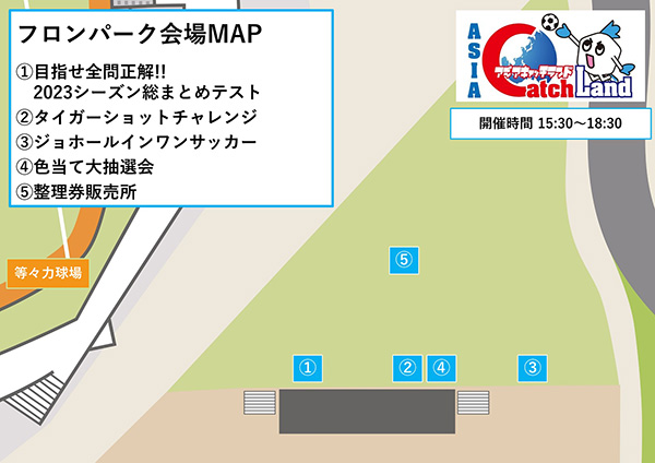 | 受付方法 | 参加券販売ブースにて、15:30より参加券の配布を開始 ※先着50名(小学生以下限定) ※「2023シーズン総まとめテスト」「タイガーショットチャレンジ」「ジョホールインワンサッカー」のうち、いずれかの参加券を購入された方のみが対象となります。 ※参加券をお持ちの方は18:05に「タイガーショットチャレンジ」実施エリアまでお集まりください。 |