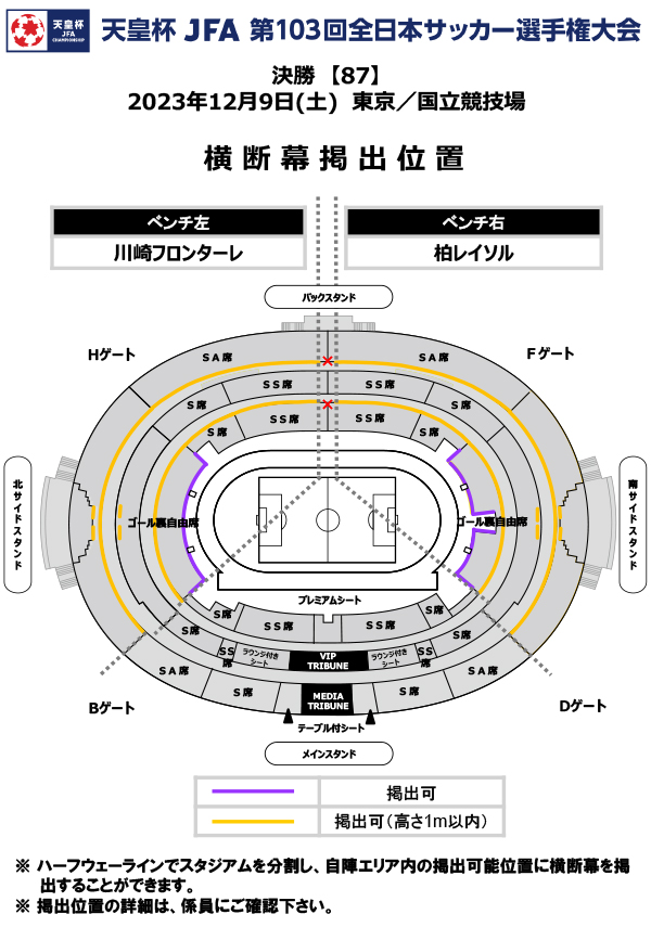 「ゴール裏自由席(1層)」の掲出可能エリアのみとし、両チームサポーター同時間帯の実施といたします。