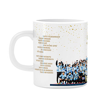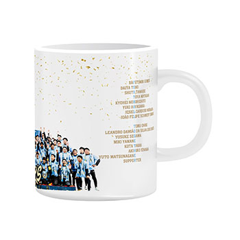 選手・コーチングスタッフが集合した写真をデザインした、このメンバーだからこそ優勝できたということを意味する記念マグカップです。