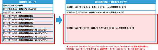 | 備考 | ・シーズンチケットで購入している席種以外の席種も購入いただけます。 ・全席指定席運用のため、先行入場権は付きません。 ・複数単位で販売するファミリーシート、グループシート、パーティーシート、ペアシート、テーブル付きペアシートに関しては、上記「購入可能枚数」とは別にご購入いただけます。なお、これらの席種については、セブン-イレブン店頭支払いはご利用いただけません。 ※下記発売を選択し、ご購入ください。 ・【川崎】シーズンチケット/QRチケット【バラエティシート】 ・【川崎】シーズンチケット/店頭発券【バラエティシート】 |