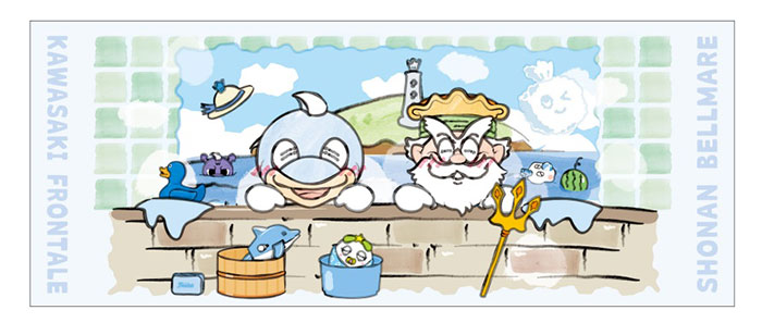 キングベルI世とおフロを楽しむふろん太。今シーズンは銭湯をモチーフにアウェイ出張販売時のコラボアイテムとして展開!! 砂でできた浴槽に、プカプカと浮かぶカブレラが咥えるのはビーチボール。沐浴するメーカブーの表情がなんとも愛くるしいデザインのタオルです!!