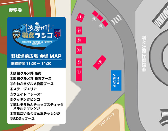 | 結果発表 | 当日14:10より、「場外 野球場前広場 ステージエリア」にて結果発表を行います。見事、投票したチームのB級グルメ丼のリストバンドをお持ちの方に、フェイスタオルのデザインにもなっている多摩川美食ラシコオリジナルの横20㎝の大きめサイズのステッカーをプレゼント!!