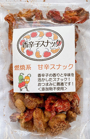 今回販売するのは、乾燥した香辛子とナッツに砂糖とシナモンで甘く味付けした、お菓子タイプの燃焼系の甘辛スナックです。燃焼系素材のカプシエイトを自然な形で摂れる食材は香辛子だけ。