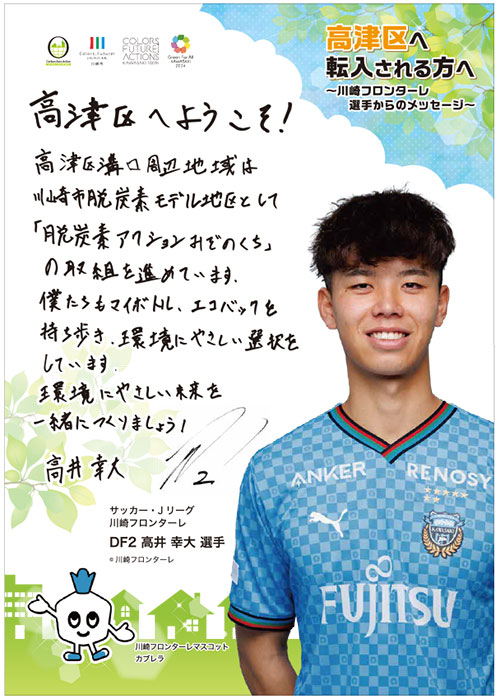 この度、高津区が制作する「高津区転入世帯向けウェルカムメッセージチラシ」に高井幸大選手が、「高津区役所地域包括ケアシステムPR庁内放送」に山田新選手が採用されましたので、お知らせいたします。