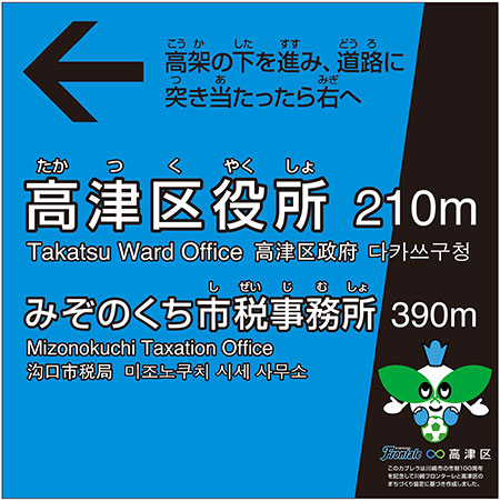 市制100周年を記念し、フロンターレブルーを基調とした視認性の高いデザインで、区役所への来庁者をわかりやすく。オリジナルのカブレラにも注目!!