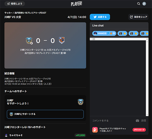 今シーズンもフロンターレアカデミーの選手たちの戦いぶりをタイムリーに皆さんにお届けするため、スポーツライブエンターテイメントアプリ「Player!」にて試合速報を実施します。