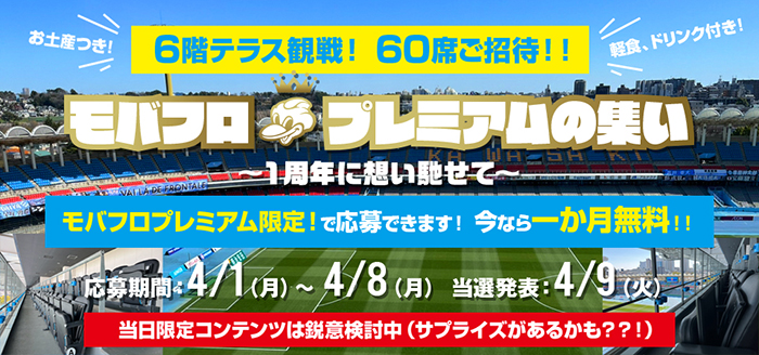 そんな皆さまに感謝を込めて「モバフロプレミアムの集い~1周年に想い馳せて~」と題し、ピッチ全体を見渡せる6階テラスシートに60名様をご招待します! 当日限定のコンテンツも鋭意検討中です! ぜひ皆様のご応募をお待ちしています!
