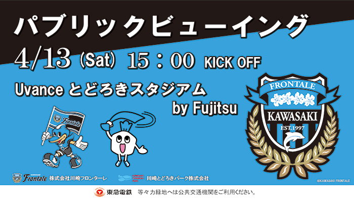 4月13日(土)明治安田J1リーグ第8節 セレッソ大阪戦のパブリックビューイングをUvanceとどろきスタジアム by Fujitsuで開催いたしますので、お知らせいたします。