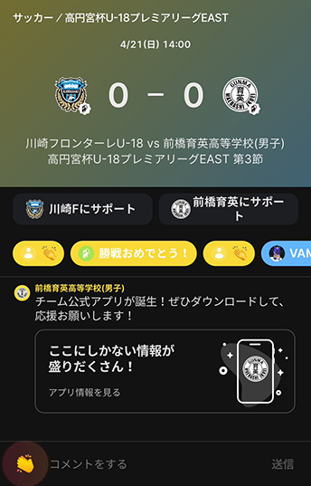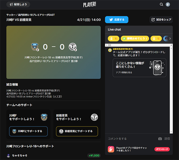 今シーズンもフロンターレアカデミーの選手たちの戦いぶりをタイムリーに皆さんにお届けするため、スポーツライブエンターテイメントアプリ「Player!」にて試合速報を実施します。