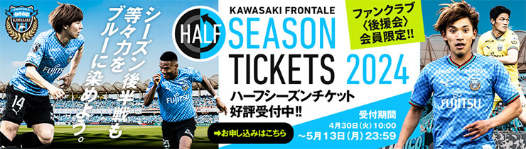 この度、4月30日(火)より受付開始となる「2024ハーフシーズンチケット」をより多くの皆様にご購入いただき、激戦必至のリーグ後半戦もフロンターレブルーに染まった一体感あるスタジアムで熱くご青援(せいえん)をいただきたく「2024ハーフシーズンチケット紹介キャンペーン」を実施いたします。
