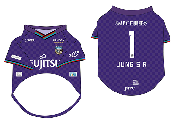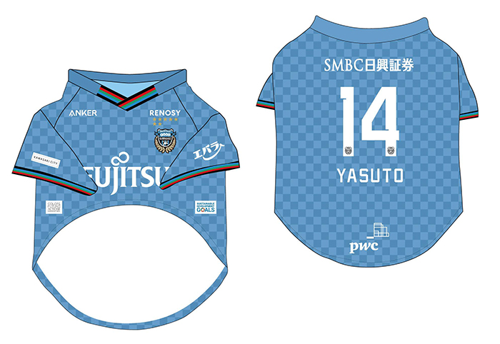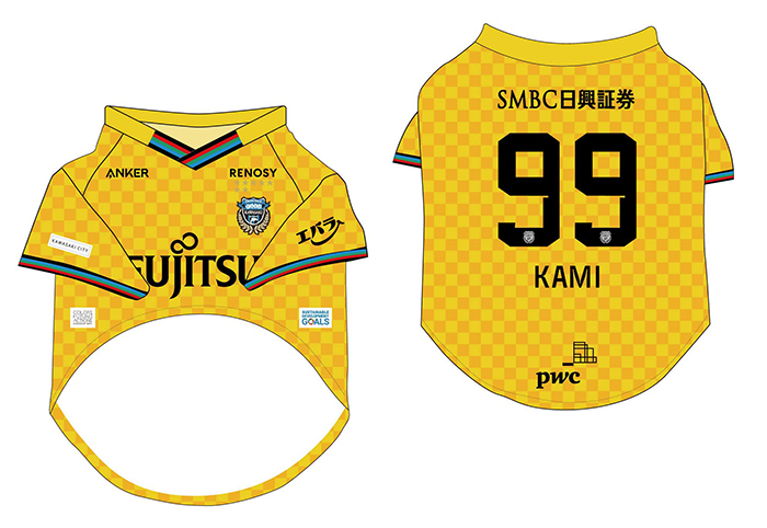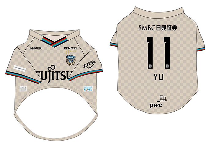愛犬にお気に入り選手のネーム・ナンバーが入ったウェアを着せこみ、フロンターレファミリーの一員に!