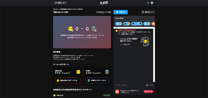 今シーズンもフロンターレアカデミーの選手たちの戦いぶりをタイムリーに皆さんにお届けするため、スポーツライブエンターテイメントアプリ「Player!」にて試合速報を実施します。