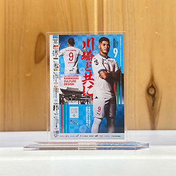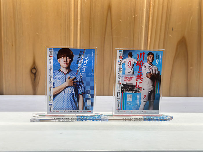 川崎市内の商店街やサポートショップの皆さんに掲出したいてだき、ホームゲームの予定を伝える「スケジュールポスター」デザインをアクリルスタンドに!! 集める楽しさも感じられるように、台座部分は“繋がる”仕様。
