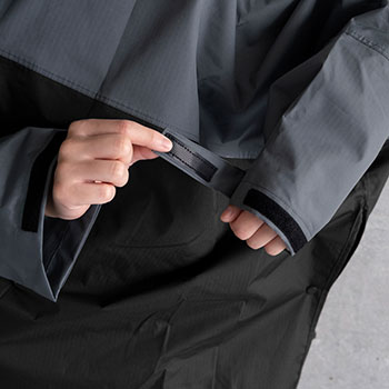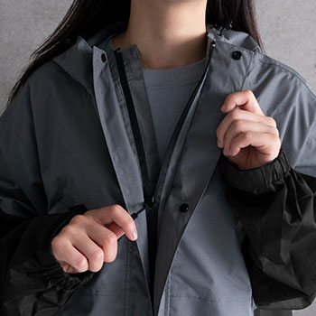 ダブルファスナー仕様なので気温に合わせて調整も簡単なレインウェアです。フード周り・袖口はぴったりフィットできるように調整でき、雨の侵入を防ぎます。