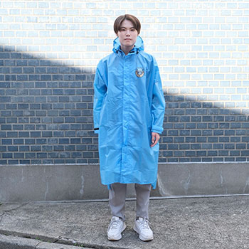 落ち着いたブルーグレーが特徴的なKiUとのコラボレインコートです。襟裏にはふろん太とカブレラがポンチョを着用したオリジナルイラストをデザインしました。
