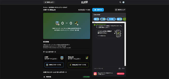 今シーズンもフロンターレアカデミーの選手たちの戦いぶりをタイムリーに皆さんにお届けするため、スポーツライブエンターテイメントアプリ「Player!」にて試合速報を実施します。