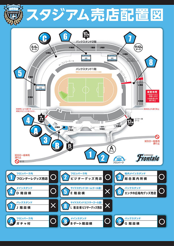 TEL 044-767-6111(営業時間 11:30~21:00/月曜定休 ※月曜日が祝日の場合は翌火曜日がお休みとなります。またホームゲーム等開催日は変更の可能性あり)