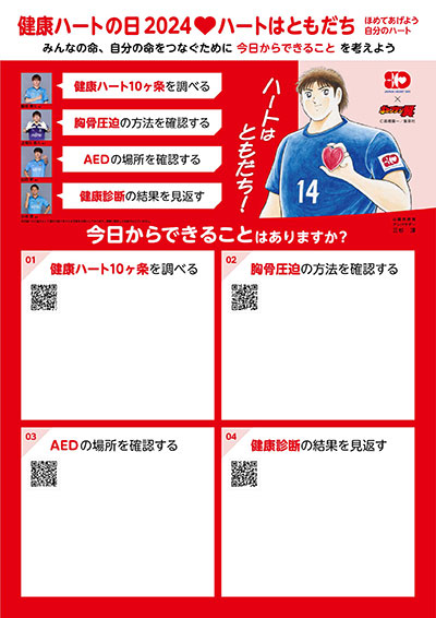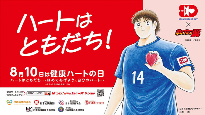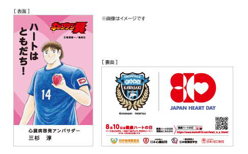 川崎フロンターレでは、8月7日(水)ヴィッセル神戸戦におきまして啓発促進ブースを出し、みんなの命、自分の命をつなぐために今日からできることを考えよう!のパネルにシールを貼って、今日からできることを一緒に考えるイベントを実施し、「健康ハートの日」オリジナルカードを先着500名にプレゼントいたします。また、選手のサイン入り心臓病啓発アンバサダーの「キャプテン翼」三杉淳オリジナルTシャツ、ポスターを抽選でプレゼントします。
