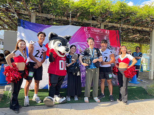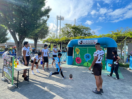 かわさきスポーツパートナーとしてもお馴染みのアメリカンフットボールチーム「富士通フロンティアーズ」の選手の皆さんのご協力のもと、さまざまな対決をする「アメフトーーク」を開催! 屈強な選手たちと楽しみながら対決をしよう!