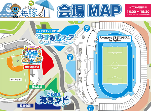 海豚(ふろん太)の日は「かわさき沖縄まつり」「かわさき海ランド」「川崎市上下水道局presents みずみずフェア」の3つのエリアで構成!!