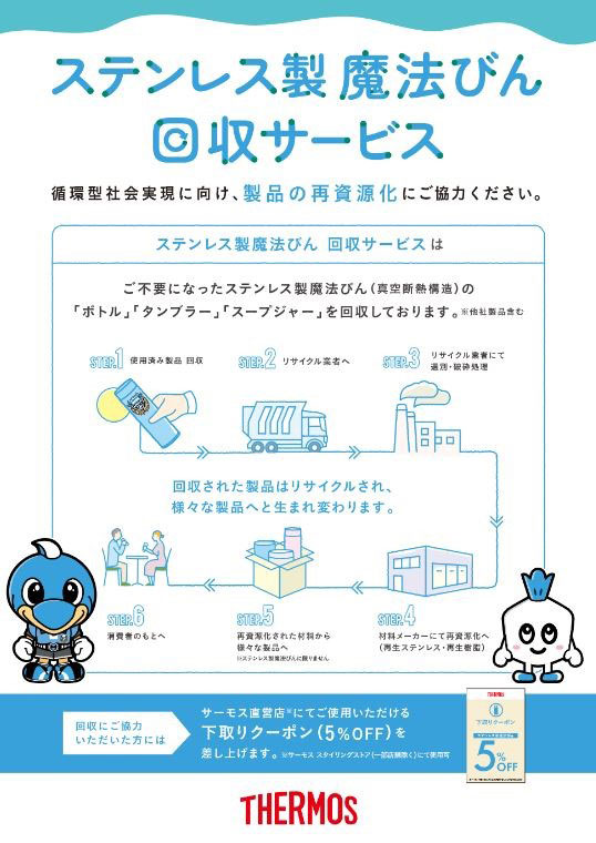 ステンレス製魔法びんの再資源化を目指し、サーモスブース内に「使用済みステンレス製魔法びん」の回収ボックスを設置します。ご不要の「使用済みステンレス製魔法びん」をお持ち込みいただいたお客様には、サーモスブースで実施している抽選会に参加できるほか、サーモス公式オンラインショップでステンレス製魔法びん購入時にご利用いただける「5%OFF 下取りクーポン」をお渡しします。