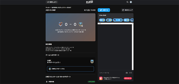 今シーズンもフロンターレアカデミーの選手たちの戦いぶりをタイムリーに皆さんにお届けするため、スポーツライブエンターテイメントアプリ「Player!」にて試合速報を実施します。