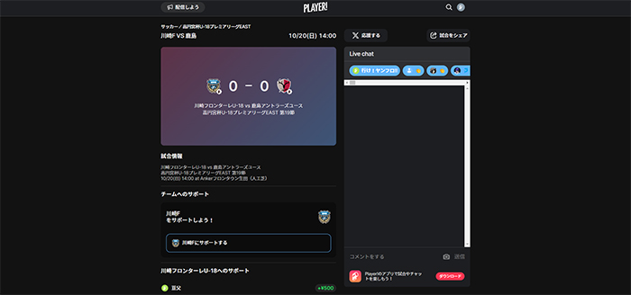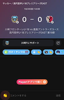 今シーズンもフロンターレアカデミーの選手たちの戦いぶりをタイムリーに皆さんにお届けするため、スポーツライブエンターテイメントアプリ「Player!」にて試合速報を実施します。