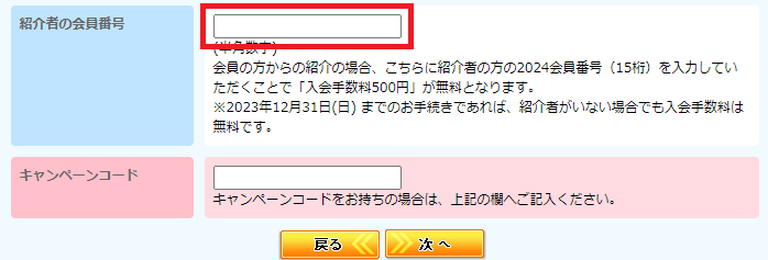 ご入会の際に、入会ページの「紹介者の会員番号」欄に紹介者の会員番号をご入力ください。