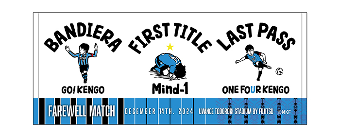 ケンゴの印象的なシーンをイラスト化。イラストは、多くのブランドやキャラクターコンテンツのデザインで有名で手描きにこだわり、手の震えやインクの滲みなど自然に起きる“歪み”を大切にし、温かくやわらかなデザインが特徴な「コウシュウマサル」氏によるもの。「初タイトル獲得でピッチにうずくまるケンゴ」、「スタンドを煽るバンディエラ」、「万人を魅了したキックフォーム」の3シーンがデザインされています。
