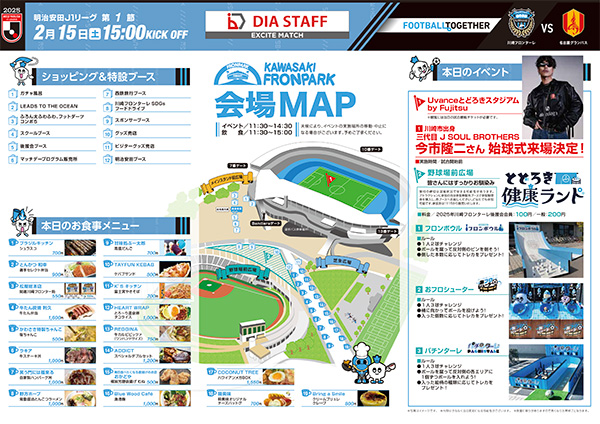 開幕戦となる名古屋グランパス戦では、サポーターの皆さんにはすっかりおなじみの「とどろき健康ランド」を開催。子どもから大人まで楽しめる「とどろき健康ランド」で身体を温めて、今シーズンの開幕戦に挑む川崎フロンターレを熱く応援しましょう!