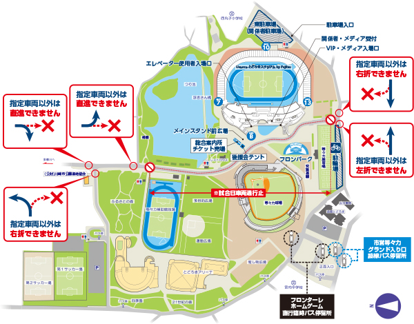 川崎フロンターレ主管のホームゲーム開催日において、来場者の安全への配慮からUvanceとどろきスタジアム by Fujitsu正面の園路につきましては、車両通行止となりますのでお知らせいたします。