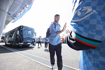 川崎フロンターレが勝利時、試合直後にピッチ横トラック上にて、選手とハイタッチをし、共に万歳三唱をします。