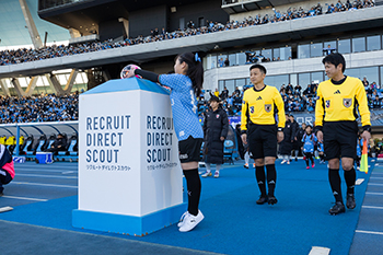 審判と一緒に入場し、ボールスタンドより試合球をピックアップしてピッチまで運んでいただきます。
