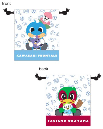 川崎フロンターレマスコットとファジアーノ岡山のファジ丸くんがデザインされた巾着です。