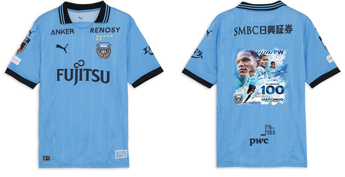 数多くスタジアムを沸かせたマルシーニョ。J1通算100試合出場を記念したメモリアルユニフォームとなります。