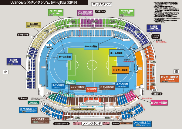 メインスタンド下層の「メインS指定(116~118ブロック)」、「メインSS指定(112~115ブロック)」、「SSS指定」及び、上層の「メインS指定(216~219ブロック)」、「メインSS指定(208~215ブロック)」はホームサポーターエリアとなりますので、横浜F・マリノスサポーターの皆様の観戦はご遠慮ください。