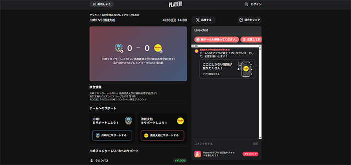 今シーズンもフロンターレアカデミーの選手たちの戦いぶりをタイムリーに皆さんにお届けするため、スポーツライブエンターテイメントアプリ「Player!」にて試合速報を実施します。
