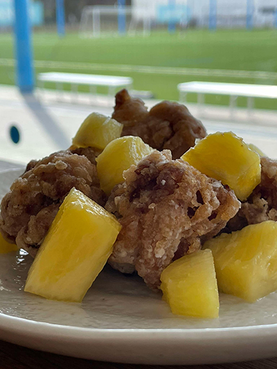 | メニュー | パイナップルとから揚げの甘酢あん |