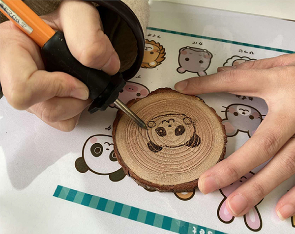 | 内容 | 間伐材をコースターサイズへカットし、はんだごてで絵を書く |