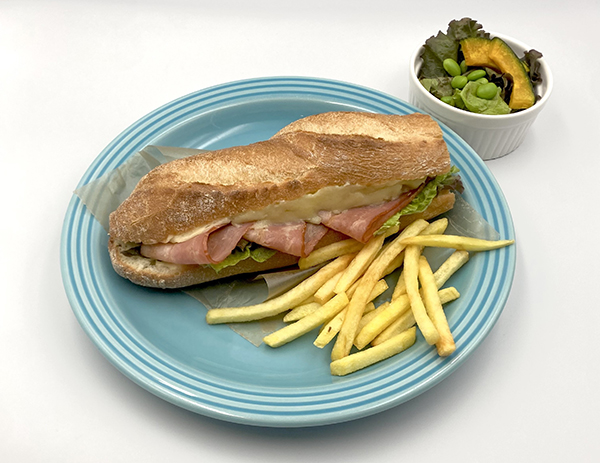 ハーフバケットにベーコンと自家製チーズソースが挟んであり、嚙み応えのあるバケットが食べ応え抜群です。