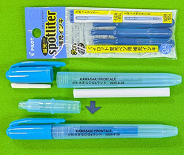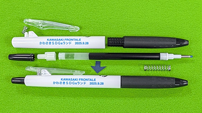 | 内容 | パイロットが展開する使用済みペンリサイクルプログラムから生まれたボールペンと、環境にやさしいインキ補充式の水色の蛍光ペンの組立ワークショップです。それぞれの筆記具に川崎フロンターレとかわさきSDGsランドがプリントされた限定品を用意してお待ちしています。 また、ご家庭に不要な筆記具がございましたら、ぜひ当日お持ちください。 |