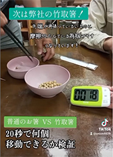 | 内容 | 竹粉配合抗菌バイオマスプラスチックで製造した、すべりにくい「竹取箸」を使用して、豆つかみゲームを開催いたします。 制限時間内に豆を多くつかむという子どもからご高齢の方までお気軽に参加できる、シンプルで楽しいゲームです。 すべりにくいバイオマスプラスチック箸でフロンターレの勝利をつかみましょう。 豆取りゲームに参加していただいたお客様に弊社「竹取箸」をプレゼントします。 |
