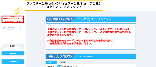 1. レギュラー会員(ジュニア会員)のアカウントにてログインし、「後援会更新はこちら」をタップ